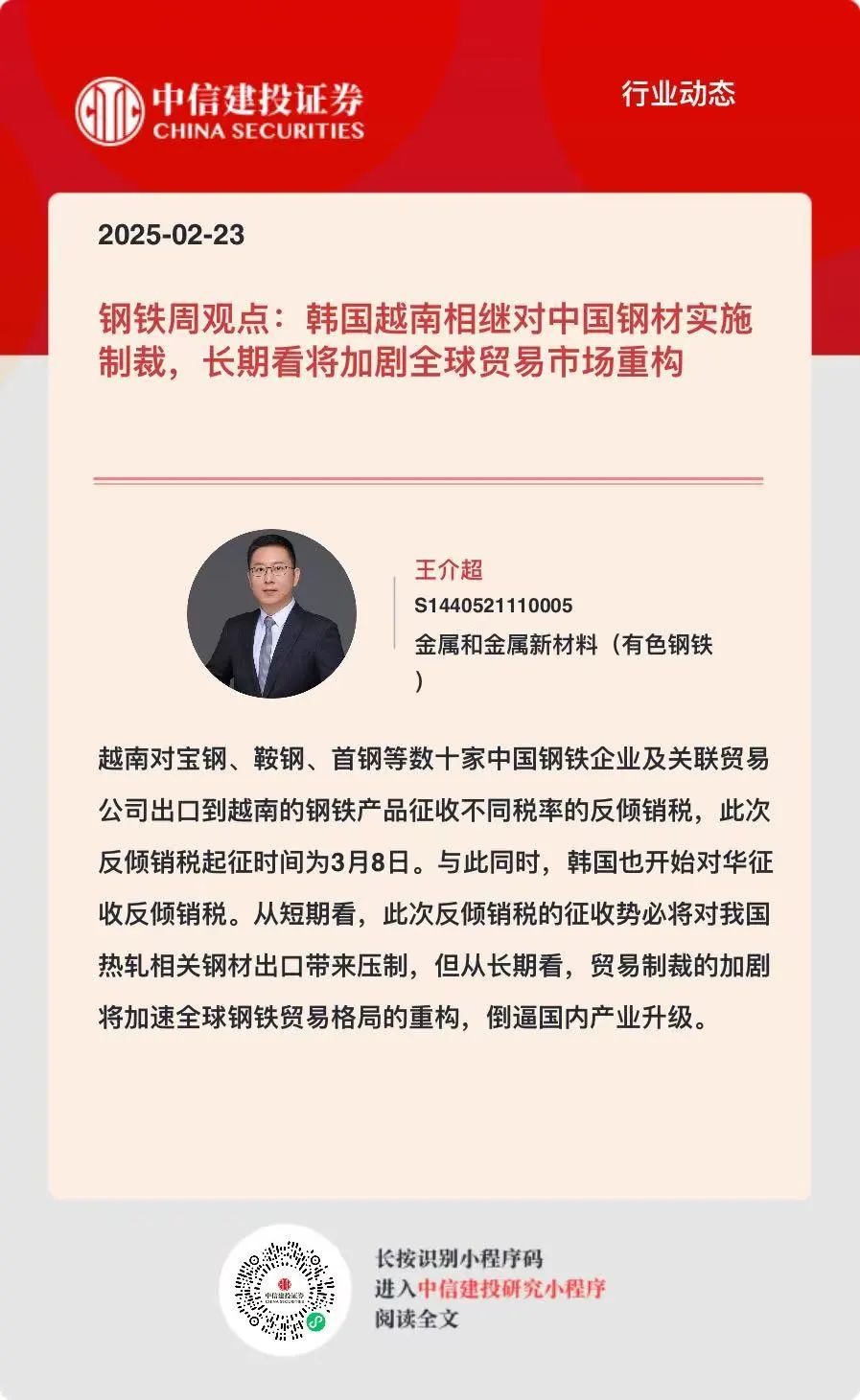2月21日,越南宣布对中国输越钢铁产品征收19.38%、26.94%和27.83%共3档的反倾销税税率。根据越南工商部昨日发布的征收临时反倾销税的文件,越南对中国宝钢股份、鞍钢、首钢、沙钢、河钢、本钢、新余钢铁、包钢、重钢、柳钢、敬业、河北安丰、纵横钢铁、燕山钢铁、日照钢铁等数十家钢铁企业及关联贸易公司出口到越南的钢铁产品征收不同级别的税率,分别是19.38%、26.94%和27.83%共3档的反倾销税税率,此次反倾销税起征时间为3月8日。就在一天前,韩国产业通商资源部贸易委员会召开了会议,针对中国进口的“碳钢及其他合金钢热轧钢板厚板产品”展开了初步调查,并初步判定存在倾销行为,称倾销带来了对韩国国内产业的实质性损害。韩国产业通商资源部贸易委员会向韩国企划财政部部长提议对华征收27.91%至38.02%的临时反倾销税。初步裁定结果,不同企业的倾销税率分别为宝钢27.91%,江苏沙钢29.62%,湘潭钢铁、赛诺国际和厦门国贸控股38.02%,其他在华供应商31.69%。越南和韩国是我国钢材第一大和第二大出口目的地国,2024年对其出口量分别为1277万吨和819万吨,占我国钢材总出口量的11.5%和7.4%。从短期看,此次反倾销税的征收势必将对我国热轧相关钢材出口带来压制,加剧我国钢铁行业的供需矛盾。但从长期看,贸易制裁的加剧将加速全球钢铁贸易格局的重构,倒逼国内产业升级。国内政策推动“控总量、优存量”,加速淘汰落后产能,推广电弧炉和废钢回收技术,降低对铁矿石进口的依赖,通过技术升级、市场多元化及国际合作,应对日益严峻的国际贸易环境。同时,伴随着全球铁矿石供应的增加,钢铁产业链的利润将重新分配,头部钢铁企业也有望迎来价值重估。